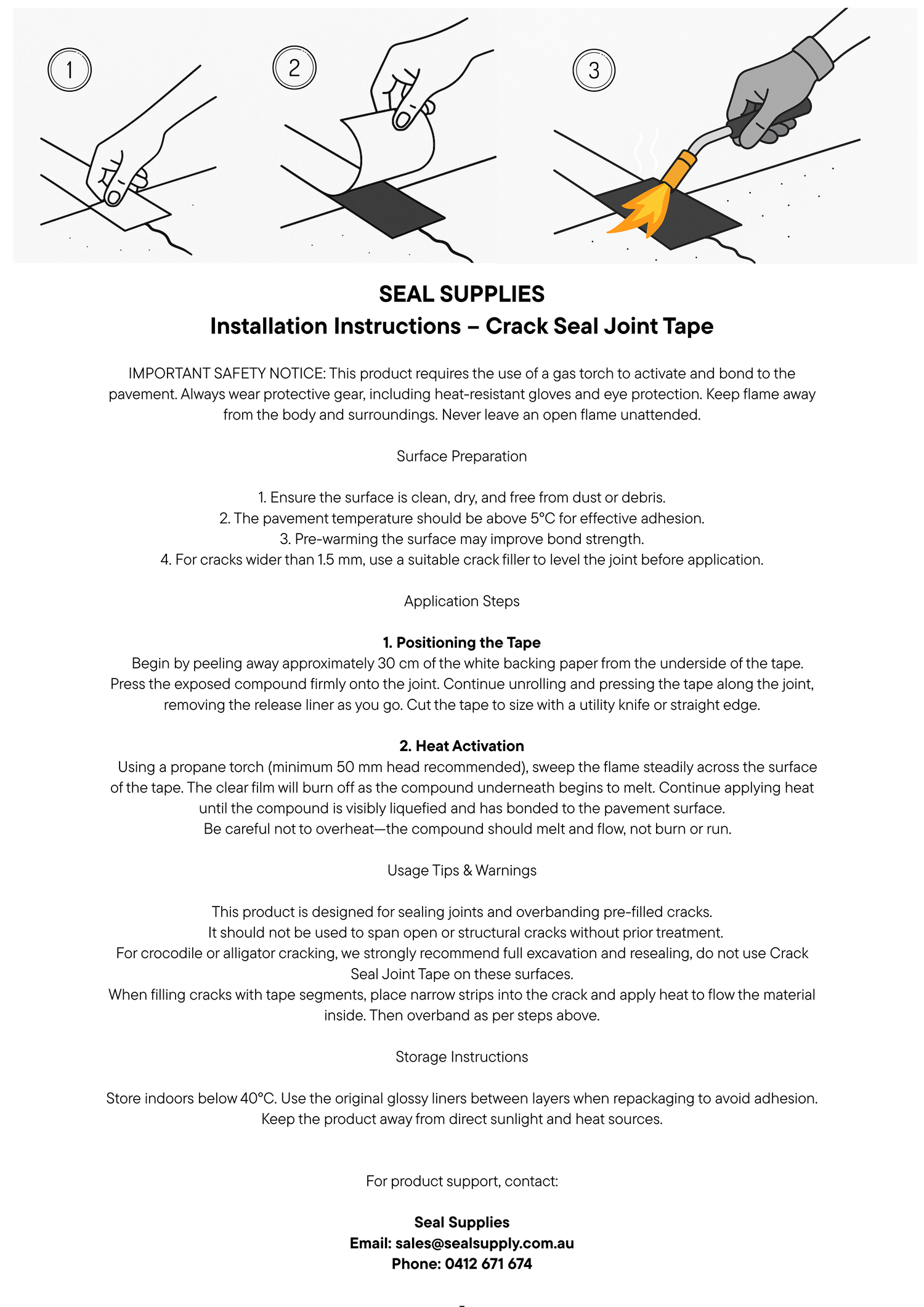 Our flagship product, Crack Seal Joint Tape, offers a fast, effective way to seal cracks and joints in asphalt surfaces. It’s heat-activated, easy to apply, and tough enough to handle harsh Aussie conditions. Whether you're fixing a small driveway or sealing road joints, we’ve got your back—with expert advice and Australia-wide delivery.